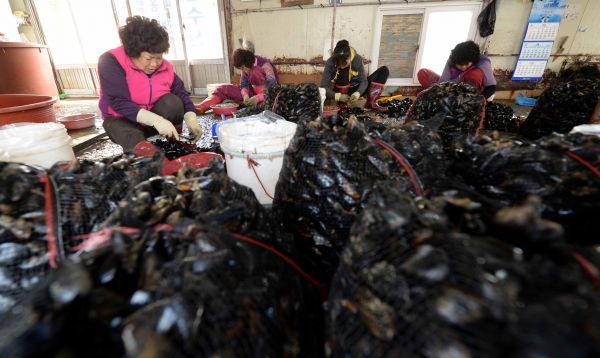 1일 오후 구복마을 한 작업장에서 아낙들이 이지역 특산물은 홍합을 다듬고 있다. |