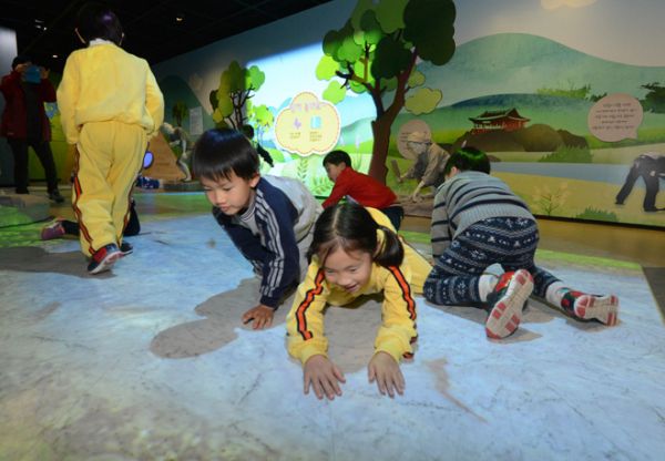 ▲지난 3일 물 문화관을 방문한 하동 북천초등학교 병설유치원 아이들이 영상으로 제작된 연못에서 물고기를 쫓으며 물놀이 체험을 하고 있다. |