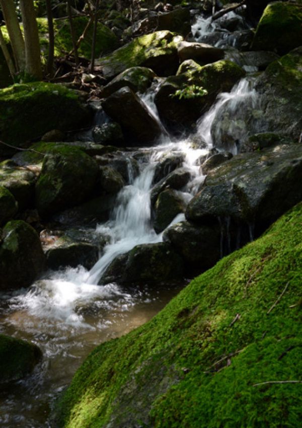11시 21분, 갈림길을 만나고 이제 임천방향으로 하산 길을 잡는다. 이끼가 많은 계곡이다. 몇 곳에서 이끼폭포를 만날 수 있어 사진촬영의 포인트가 되기도 한다. 내려서 닿은 곳은 모전마을. 아스팔트 도로에 서면 가까운 곳에 용유담과 용유교가 보인다. 일행은 오른쪽으로 꺾어 모전마을회관 앞을 지나 오른다.