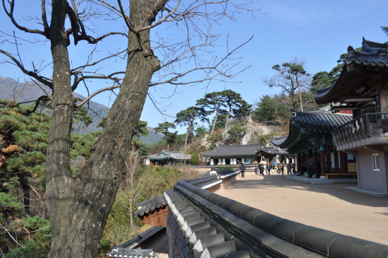 열두 장 달력이 달랑 한 장이 남아서 볼품없이 초라한데 뜨개실로 짠 모자와 목도리에 벙어리장갑을 끼고 승복을 입은 꼬마동자승은 제 키보다 더 큰 대빗자루를 끌고 일주문 아래서 방긋이 웃는다. 천진난만한 해맑은 모습이 연말의 아쉬움을 짓궂게도 서글프게 하여 입산수도를 위한 출가라도 하듯이 일상을 훨훨 털어버리고 집을 나섰다. 양산시가지의 끝자락이며 상가건물이 촘촘히도 즐비한 하북면의 날머리와 맞닿은 통도사 일주문인 매표소를 들어서자 짙푸른 솔숲이 끝 간곳을 알 수 없이 사방으로 뒤덮었다. 초입의 안내판에는 ‘무풍한송로’라 하여 찬바람에 흔들리는 소나무가 춤을 추는 듯하다는 길이라고 하였건만 바람이 없으니 흔들림이 없고 흔들림이 없으니 사방은 고요할 뿐 일렁거림은 오직 띄엄띄엄 오가는 탐방객일 뿐이다.