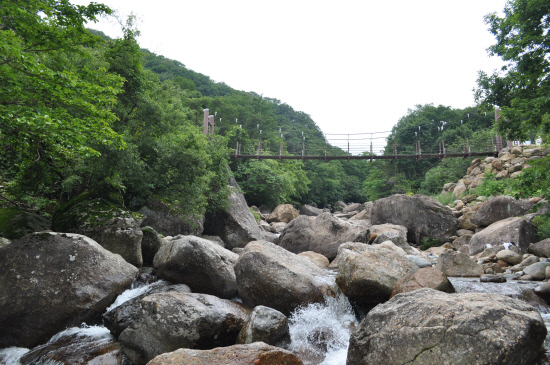 천왕봉 8.8㎞라고 일러주는 등산길을 안내하는 표지판을 따라 오솔 길로 잠시 접어들면 이내 ‘무제치기폭포’와 ‘치밭목 산장’을 거쳐 천왕봉으로 오르는 등산길의 초입에 출렁다리가 나온다. 집채 같은 바윗돌의 틈새마다 폭포수가 쏟아지는 그림 같은 비경위에 계곡을 가로지른 높다란 출렁다리를 건너는 산객들은 백의민족의 영산인 성모천왕의 품으로 오늘도 줄줄이 발길을 이어간다.