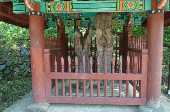 속계와 법계의 가름을 없애려 함이던가. 일주문도 없고 천왕문도 없다. 악귀는 범접을 말고 속인은 삿된 생각을 버리라며 위풍당당하게 섰던 호법대신과 금호장군의 목장승도 세월의 무게가 버거워서 퇴역을 하고 이제는 비 가림의 보호각 안에 안치되어 나란하게 섰는데 금호는 어쩌다가 눈도 코도 잃었으며 둘은 하나같이 깊이 파인 주름살만 빈틈없이 남겼을까.