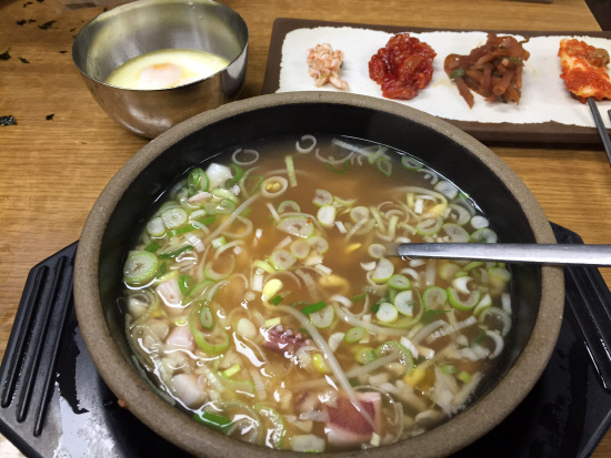 객지에서 모처럼 단잠이다. 서둘러 24시간 사랑받는 전주 콩나물국밥을 먹기 위해 남부시장으로 간다. 추위에도 아랑곳없이 온갖 물건들로 가득한 시장거리 걸으며, 김이 모락모락 나는 두부를 보고 침 흘리는 벗이 있으니, 두부 몇 모까지 준비하여 현대옥으로 들어서 국밥이 나오기 전 그냥 두부부터 먹으며 꿀맛이란다. 전국의 콩나물국밥 중 전주콩나물국밥을 으뜸으로 치는데, 뚝배기에 밥과 콩나물을 넣고 갖은 양념을 곁들여 펄펄 끓여 내는 여기 콩나물국밥이 최고다.
