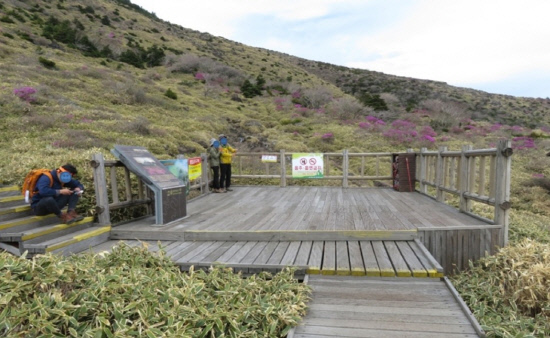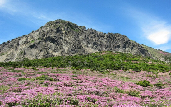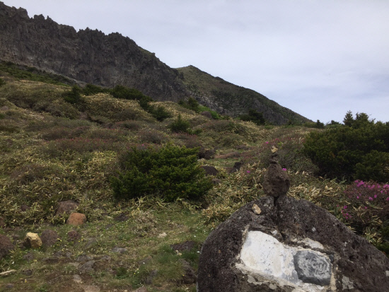 오후 12시10분, 남벽분기점(1600m)에 도착하니 일행들이 김밥으로 맛있게 점심식사를 하고 있어 적당한 자리를 잡고 앉으니 남벽이 코앞이고, 넓게 퍼진 철쭉들이 아직은 조금 이른 듯하지만 그래도 장관이다. 다시 남벽분기점을 출발하여 윗세오름대피소(1700m) 병풍바위를 지나며 잠시 자리를 잡고 앉아, 한라산의 털진달래와 산철쭉을 동시에 볼 수 있는 곳을 정리해보니, 앞에서 말했던 방애오름 움텅밭 탑궤 만세동산 등을 손꼽을 수 있겠고, 이 중 윗세오름 주변 고원지대인 선작지왓과 남벽 기슭은 시기를 잘 맞추면 ‘꽃바다’라 할 정도로 아름답다.