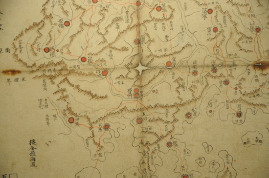 ▲ 조선 후기 경상도 군현을 표시한 경상도지도. 진주가 부산 방면에서 호남으로 가는 길목이라는 것을 여실히 보여주고 있다. 국립진주박물관 전시