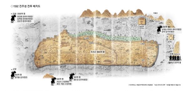 조선군의 병력은 불과 3800여 명. 일본군 병력의 10/1 수준에 불과했다. 병력이 절대열세인 것을 감추기 위해 김시민은 휘하 장수들에게 성안에 큰 용을 그린 깃발을 세우고 휘장과 장막을 성내 곳곳에 설치했다. 성 안에 있던 백성들 중 노인과 여자들에게도 남복을 입혀 군사의 수가 많아 보이게 했다. 말발굽이 일으킨 흙먼지와 여기저기 세워진 휘장과 장막, 남복을 입은 백성들을 본 적군은 진주성의 병력이 예상보다 많다고 여겼다.