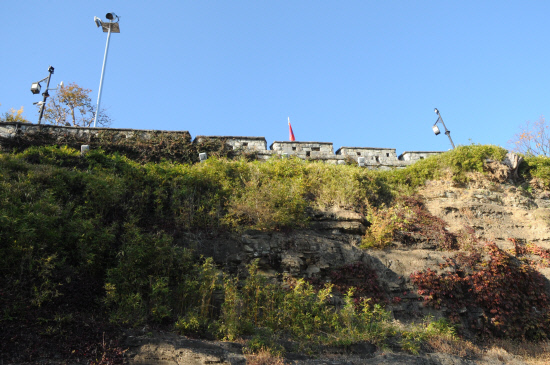 ▲ 진주성 성벽, 남강변에서 바라본 진주성의 성벽은 야트만한 야산에 지어져 있는데다 성 주변에는 해자와 늪이 있어 공격이 여의치 않았다.