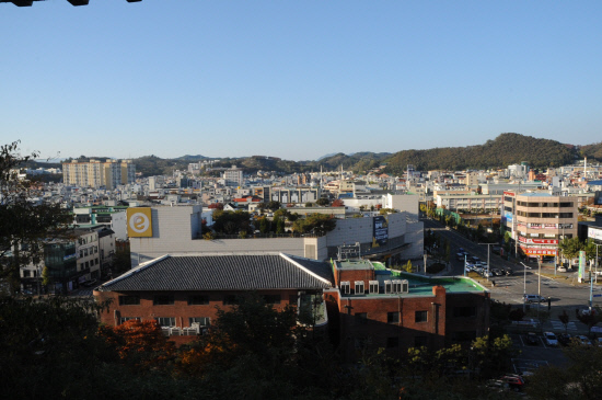 ▲ 진주성 북장대에서 바라본 진주 도심 전경. 도심의 이마트 건물을 비롯한 도심 전경이 한눈에 들어온다. 기록에 의하면 지금의 진주경찰서 부근에 일제강점기 시절 메워진, 성을 방어하는 해자와 늪인 대사지가 있었다.
