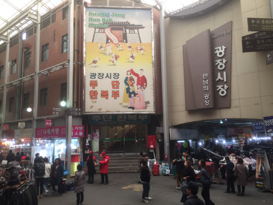 광장시장에는 오래된 세월에 비례하여 먹을거리도 다양한데, 등록된 90여 개의 식당에는 육회 잔치국수 토스트 순대 마약김밥 족발 모듬전 등의 다양한 먹을거리가 있으며, 이들 중 마약김밥과 빈대떡은 광장시장을 대표하는 먹을거리에 올라있다. 한 번 맛을 보면 마약처럼 계속 먹게 된다고 해서 명명하였다는 마약김밥은 먹어보니 과연 그렇겠구나 하는 생각이 들었고, 친구가 안내하는 집들은 줄을 많이 서 조금 기다려야 해 불편했지만, 여기서 제일 맛있다는 빈대떡, 육회골목의 육사시미, 마약김밥에 어묵국까지 광장시장에서 3차를 하고는 바로 청계천을 따라 걸어 한양 투어에 나섰다.