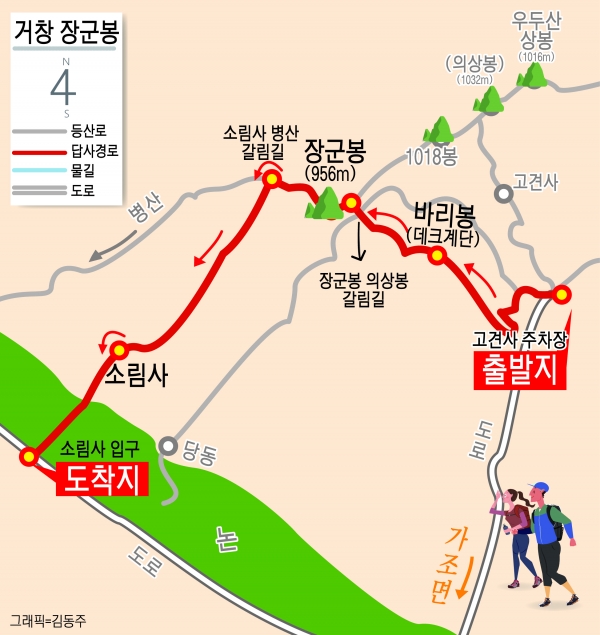 ▲등산로:고견사 주차장→데크 계단→바리봉→능선·삼각점→장군봉·1018봉 갈림길→장군봉→당동갈림길→소림사·병산갈림길→소림사→소림사 입구→고견사 주차장 회귀