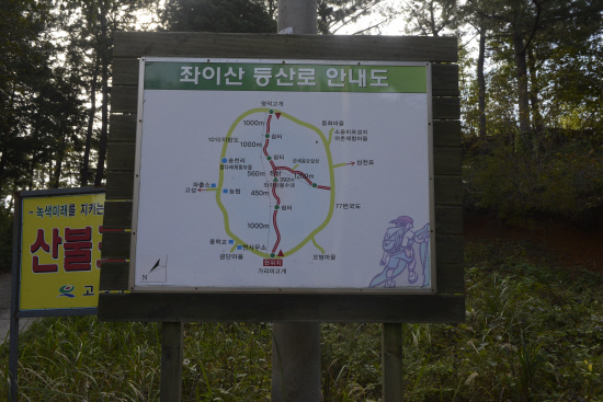 △등산로: 가리미고개→임도→너덜지대 →전망대→좌이산 정상→청룡사 갈림길→전망대→철계단 벼랑길→전망대→진양정씨 묘원→명덕고개(골고개)