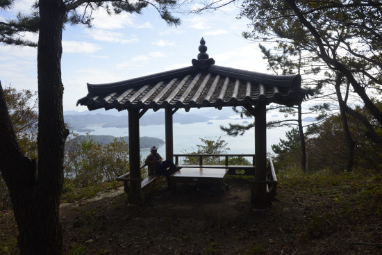 출발 1시간만에 정자가 있는 전망대에 도착한다. 이 산에는 5개정도의 전망대가 있는데 그만큼 조망권이 좋다는 방증이다. 처음부터 끝까지 고성 앞바다의 다도해가 시시각각 형태를 달리하며 시선을 강탈한다.