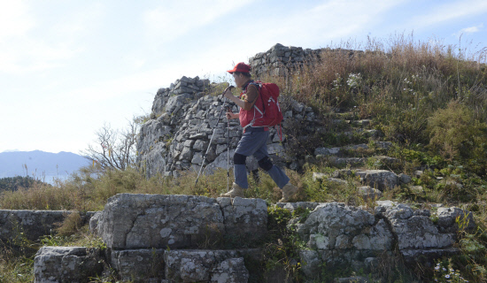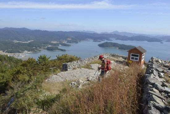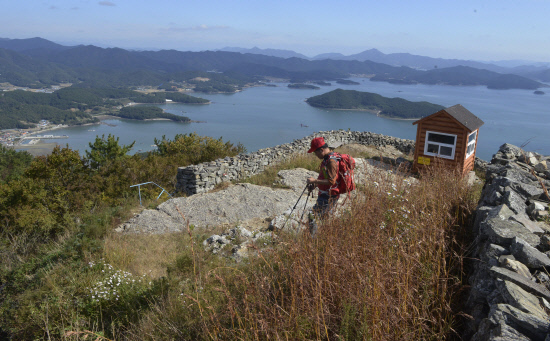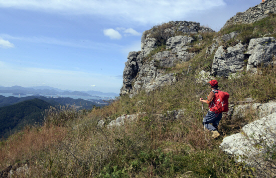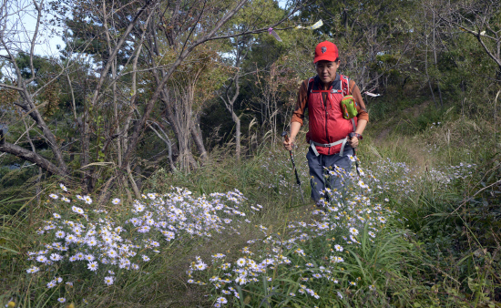 내륙엔 벼논의 수확이 진행되면서 차츰 빈들이 돼가고 있는 모습이다. 그 뒤로 무이·수태산이 다가온다. 그 오른쪽이 거류산, 왼쪽에 삼천포 와룡산 상사바위 세섬봉 민재봉이 선명하다. 길은 아름답고 숲은 울창하며 해풍은 시원하다. 늦 가을 등산로에 핀 구절초와 들국화가 산상 화원을 이루고 있다. 인공적이지 않은 산국밭을 앞서가는 동행 산우의 뒷모습이 마치 구름위를 걷는 것처럼 가벼워 보인다.