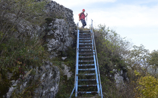 숲속에 큰 벼랑이 보이는가 싶더니 곧 정상이다. 높은 지역임으로 파란 하늘색 철계단을 통해 올라갈수 있다. 천국 정상으로 가는길, 조심스럽게 계단을 밟고 올라서면 사방이 활짝 열린다. 감탄사가 터진다.