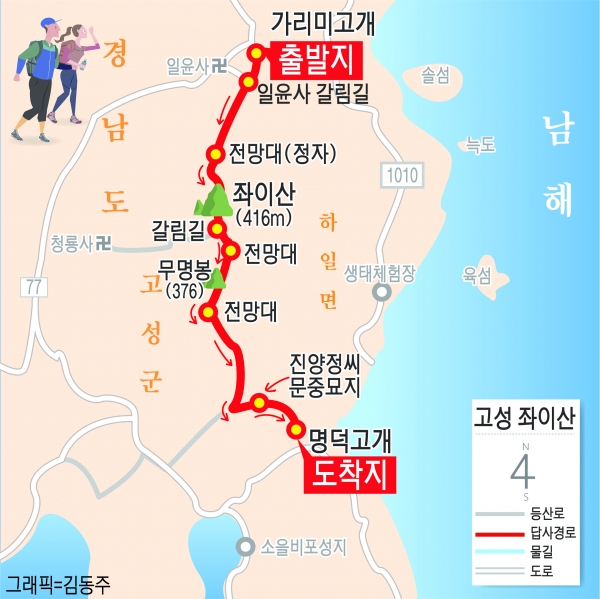 △고성군 하일면 학림리와 오방리를 연결하는 가리미고개가 들머리다. 삼천포 넘어가는 77번국도상이다. 차량 둘곳이 마땅치 않아 도로 옆 임도까지 올려세워야한다.