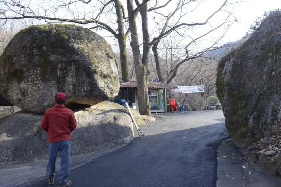 ▲쌍계사 입구 쌍계석문은 최치원의 쇠지팡이로 썼다는 철장서로 전해진다. 법계와 속계를 구분하는 경계라는 의미가 있는 곳이다. 새 도로가 나면서 한쪽으로 밀려 기능이 다소 퇴색됐다. 이 글씨를 보려면 차량을 세워놓고 민가가 있는 공터로 찾아들어가야 한다.