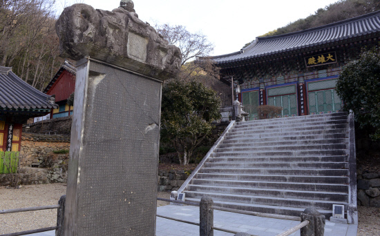 쌍계사 대웅전 앞에 서 있는 진감선사 대공탑비가 눈길을 끈다. 피탄 자국이 곳곳에 나 있고, 깨지고 파손된 모서리를 쇠창살로 고정시켜놓았다.