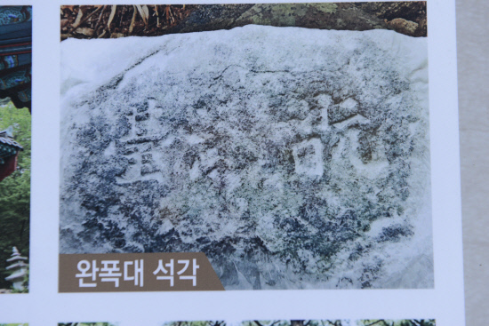불일폭포를 바라보는 지점에서 어슴푸레하게 씌어진 ‘완폭대’ 석각을 찾았다. ‘불일폭포를 완상하며 노니는 바위’라는 뜻의 완폭대는 고운이 쓴 것으로 알려져 있다. 최근 지리산 국립공원사무소에서 완폭대를 발견해 세간에 화제가 됐다. 고운의 설화가 역사적 사실로 드러난 재미 있는 사례다.
