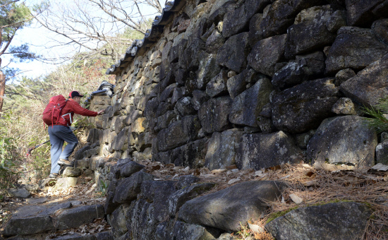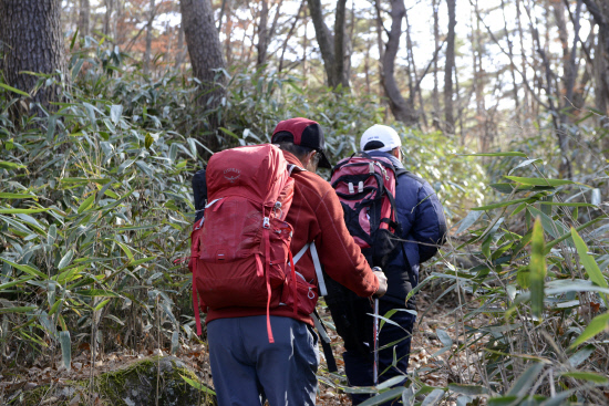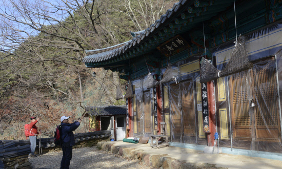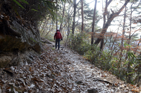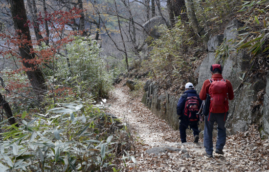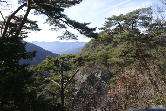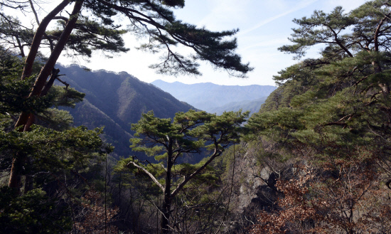 일제 때 송진을 빼간 상처를 안고 사는 소나무 곁을 지나고 20여분 만에 계곡 위를 관통하는 작은 나무다리를 건넌다.