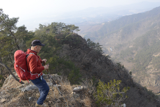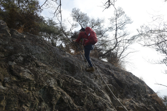 곧 로프에 의지해야만 오를 수 있는 높은 벼랑길이 나온다. 첫번째 벼랑을 통과한 뒤 이어지는 암릉은 길이 선명하지 않아 바위를 부여잡고 게걸음을 하듯이 비스듬하게 올라가야한다. 얕봤다가는 사고로 이어질 수 있어 조심해야할 구간이다.