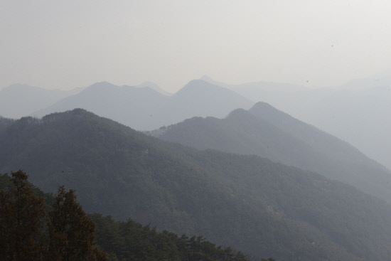 숨 가쁜 오름길의 끝, 드디어 자지산 정상에 닿는다. 들머리에서 1시간 10분만이다. 갑자기 감탄사가 터진다. 정상의 기쁨보다 멀리 보이는 산그리메가 더 감동적이다. 낙타등처럼 생긴 특이한 산봉우리가 겹겹이 쌓여 이국적인 모습이다. 그야말로 만학천봉, 조금 과장하면 중국의 유명산을 보는듯하다. 천태산을 비롯한 대성산 장령산 서대산 실루엣이다.