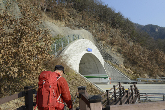 숲속의 전망대를 지나 데크 계단을 내려선 뒤 부엉산 터널 앞 천내교를 걷는다. 천내교 밑 강가를 따라 걸으면서 병풍처럼 펼쳐진 자지산 부엉산의 자태를 감상할 수 있다. 여름 한때 산으로 물을 뽑아 올려 떨어뜨리는 인공폭포도 가동하는 모양인데 겨울인 지금은 개점휴업상태다.