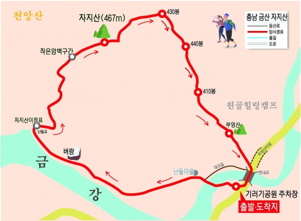 자지산 정상 못 미친 지점 드센 바위길을 타고 걷는 짜릿함, 금강과 평야를 바라는 정상에서의 조망, 강과 어우러져 웅장한 경치를 감상하는 여유로운 강변의 산책, 이 산을 찾을 이유는 한두개가 아니었다. 7.5㎞, 휴식포함 4시간 소요.
