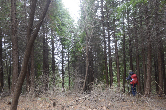 편백 숲을 떠나 산등성이까지 길고 긴 임도가 이어진다. 푹신한 길은 잊었다. 능선 끝에서 산으로 난 길을 따라 올라간다. 비교적 등산로는 선명하다. 이번엔 웃자란 서어나무 굴참나무 떡갈나무 갈참나무가 차례대로 등장한다.