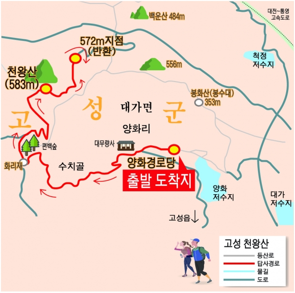 ▲등산로:고성군 대가면 갈천리 양화마을→임도→자전거도로→편백나무 숲→화리치 갈림길→서어나무숲→정상→봉앞(반환)→무량사→양화마을회귀