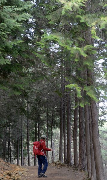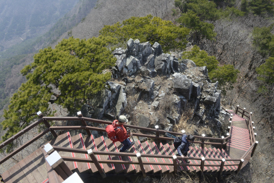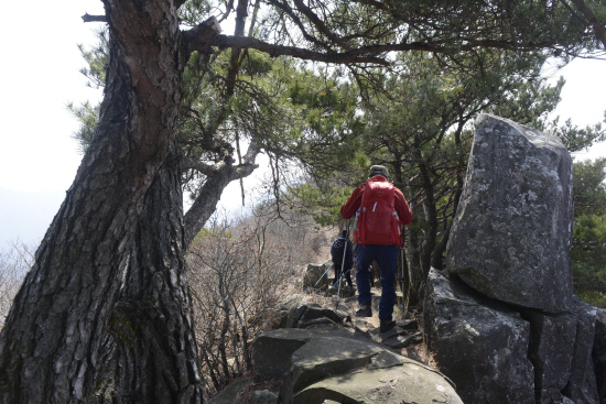 가야할 산정에 주상절리 같은 거대한 바위덩이가 보인다. 제주 한라산 영실코스 산정풍광을 닮았다. 저절로 감탄사가 나올 정도로 큰 바위가 인상적이다. 소나무군락이 시작된다. 솔숲 솔향이 봄바람에 실려 온다. 큰 쉼 호흡으로 마시는 아침의 피톤치드는 상쾌함을 준다.