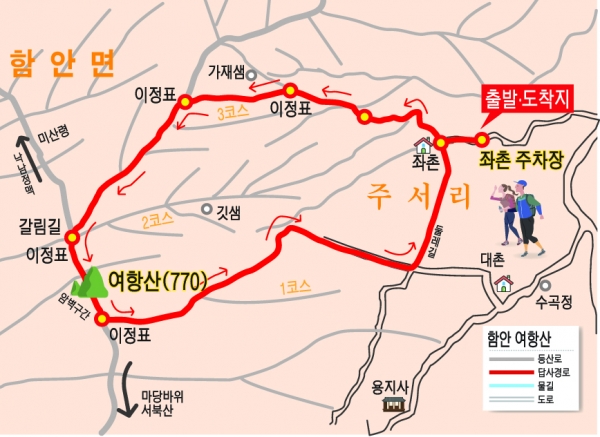 ▲등산로:함안군 주서리 좌촌마을주차장→마을 상부 1·2코스갈림길→2·3코스 갈림길→3코스→가재샘→낙남정맥 능선→헬기장→여항산 정상→갈림길→1코스 및 여항산 둘레길→좌촌마을 회귀