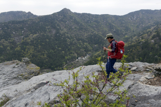 이번에는 돌탑이 있는 갈림길이다. 오른쪽은 시루봉 도덕산으로 가는 길이고 정면은 취재팀의 진행방향이다. 이곳 어딘가에 둥지가 있는지 말똥가리 한마리가 인기척에 놀라 하늘로 솟구쳤다.