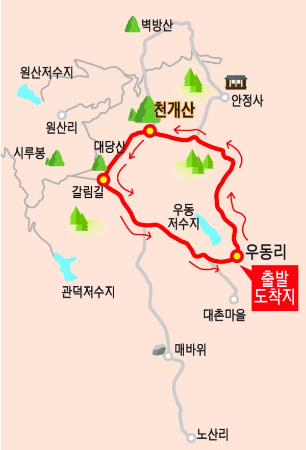 통영시 광도면 우동 1길 천개마을회관을 지나 버스정류장이 출발지이다. 정면 우동저수지에서 내려오는 수로를 따라 돌아 200m진행한 뒤 작은 교량을 건너자 마자 왼쪽에 천개산 등산로가 열려 있다.