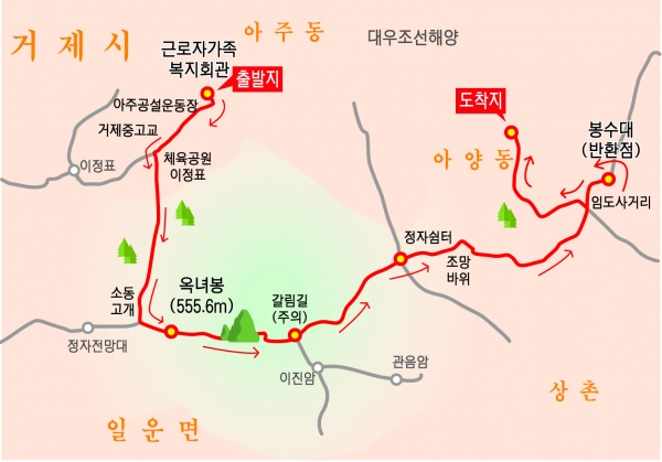 ▲등산로: 거제 근로자가족복지회관→체육공원갈림길→임도 철계단→소동고개→헬기장→옥녀봉→이진암·관음암갈림길→경주정씨묘→정자쉼터→조망바위 봉수대→이정표갈림길→왼쪽 대우조선해양방향 하산