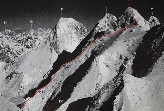 가셔브롬2봉 주변에 있는 산들 왼쪽부터 H=바인타브락(7285m), G=무즈타그 타워(7273m), F=가셔브롬4봉(7925m), E=가셔브롬3봉(7952m), C=세계 2위봉 K2(8611m). 가셔브롬2봉 구간별 루트 1캠프~2캠프=해발 5900m 1캠프에서 6500m 2캠프 고도차는 600m. 등반 시간은 고소에 적응을 마치면 평균 5~6시간이 걸린다. 이 구간은 급사면이 시작되는 지점까지 약 1시간 정도 설원을 지나야 한다. 이후 고정 로프를 설치하며 바나나처럼 굽은 ‘바나나 리지’를 통과해야 한다. 설릉을 따라 ‘나이프 리지’에 올라서면 2캠프가 나타난다. 텐트 10여 채를 칠 수 있는 비교적 좋은 캠프 사이트다. 2캠프~3캠프=3캠프(6900m)까지 고도차는 약 400m로 비교적 짧다. 약 5시간 정도 소요되며 중간부터 50도 정도의 설사면이 3캠프까지 계속 이어진다. 설사면을 통과하면 눈을 깎아내 텐트를 설치해야 한다. 가셔브롬2봉과 가셔브롬3봉 계곡을 넘어 불어오는 바람의 영향을 많이 받는다. 3캠프에서 바라보는 카라코람 산맥의 파노라마가 인상적이다. 3캠프~4캠프=3캠프 우측에 있는 암벽지대를 따라 완만한 설사면을 300m 정도 횡단한 후 본격적인 급경사를 만나게 된다. 중간부터는 설벽 곳곳의 바위들이 불안정해 낙석 사고 우려가 높아 주의가 요구된다. 정상 좌측 암벽지대 모서리 아래쪽으로 7350m 4캠프까지 고도차는 450m. 소요시간은 4~6시간이며 텐트 바로 아래는 남벽 급사면이라 장비 분실 위험이 있다. 4캠프~정상=8035m의 정상까지 표고차는 685m로 가장 긴 구간이다. 정상 피라미드 아래쪽 설사면을 우측으로 횡단해 약 7750m에서 왼쪽으로 방향을 틀어야 한다. 이 구간은 경사가 급해 고정 로프가 필요하다. 이곳에서부터 본격적인 등반이 시작된다고 할 정도로 힘든 구간이다. 급설사면이 끝나면 설릉이 나온다. 바람이 강하게 불면 매우 위험하다. 소요 시간은 총 7시간이다.