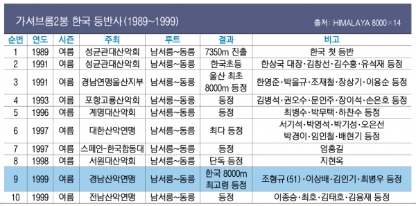 1999년 경남산악연맹은 8000m급 원정에 3개 원정대가 참여했다. 파키스탄 카라코람에 위치한 가셔브롬4봉 원정대를 필두로, 가셔브롬2봉(8035m) 원정대, 영호남 산악인들이 참여한 K2(8611m) 원정대였다. 가셔브롬2봉 원정대는 이병갑 등반대장(53)을 중심으로 조형규(51)·이상배(46)·김인기(30)·최병우(29) 대원이 참여했다. 말 그대로 소규모 원정대였다. 이번 원정에 참여한 대원들은 경남산악연맹이 야심차게 준비한 파키스탄 8000m급 4개봉 동시 등정에 참여할 계획이었다. 그러나 IMF 영향으로 프로젝트는 무산되고 가셔브롬2봉 원정대가 구성된 것이다.