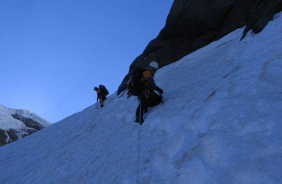 최임복과 셰르파는 위로, 강종헌 대원은 아래로 향했다. 랜턴에서 나오는 가느다란 불빛만을 의지하고 한발 한발 내디뎠다. 아무것도 볼 수 없는 답답한 상황은 체력적으로 더 힘들게 했다. 얼마나 올랐을까? 해가 떠오르기 시작했다. 가파른 설벽을 오르다 내려다본 발아래는 천길 낭떠러지였다. 고정 로프도 없었다. 이제 순수한 자신만이 자신을 지킬 수 있는 상황이었다. 최임복 대원과 셰르파들은 로프로 서로 몸을 묶었다. 정상은 쉽게 모습을 보여주지 않았다. 지겨운 설벽은 끝날 기미가 없었다. 배가 고팠다. 커피 한잔으로 때운 아침은 여기까지였다. 목도 말랐다. 배낭에 물이 있었지만 벗을 수가 없었다. 마지막 캠프를 출발한 지 12시간이 지났다.