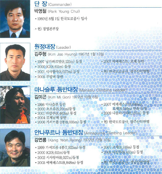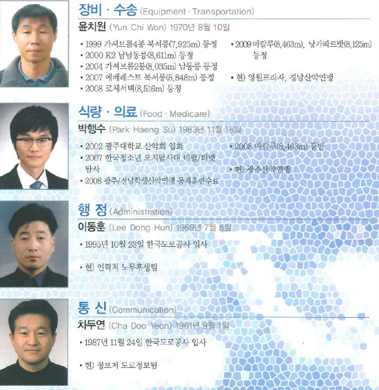 김주형 원정대장과 윤치원·강연룡·김미곤 대원·김홍빈 대원은 10년 넘게 히말라야를 다니며 많은 산을 등반한 베테랑들이었다. 막내 박행수 대원(29세)은 2002년 광주대학교 산악회 입회한 후 2007년 한국청소년 오지탐사대원으로 네팔과 티베트를 탐사했다. 2008년에는 마칼루를 등반하며 8000m 거봉을 밟았다.