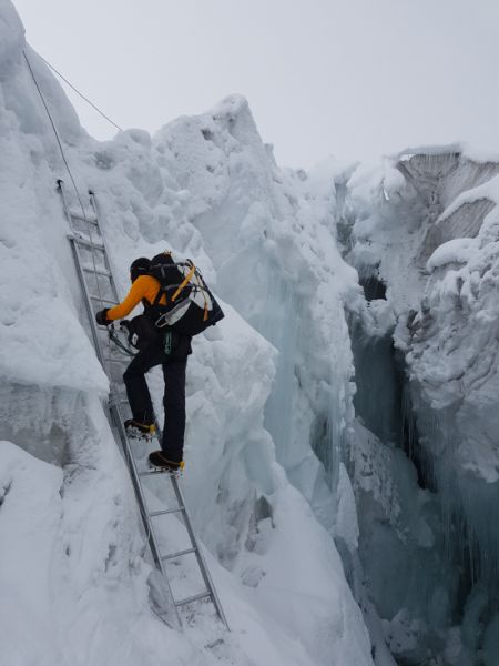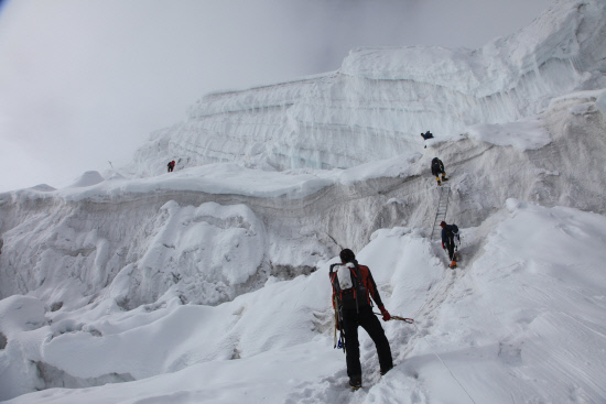 거대한 설벽이 시작되는 곳에서부터 수색을 시작했다. 지난 5년간 발견되지 않은 것은 깊지 않은 크레바스에서 비박을 했을 가능성이 높았다. 대원들은 틈이 있는 곳을 집중적으로 뒤졌다. 약간의 틈이 있는 설벽 구간은 피켈로 얼음과 눈을 헤치고 살폈다. 강연룡은 2010년 사용했던 빨간색 로프를 발견했다. 로프가 눈 속에 깊게 묻혀 있어 확인하는 데 어려움을 겪었다. 강연룡은 윤치원을 마지막으로 목격한 지점에 도착해 필사적으로 수색했지만 찾을 수 없었다.