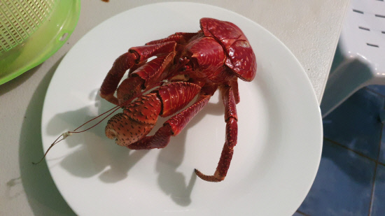 껍데기는 마치 랍스타를 연상케했다. 열을 받아 시뻘겋게 변한 코코넛크랩을 접시에 넣고 팔 한쪽 엉덩이를 분해해가며 먹었다. 너무 뜨겁고 껍데기가 있어 편하게 먹을 수는 없었지만 살짝 깨뜨린 뒤 속살을 골라 먹으니 먹을 만했다.
