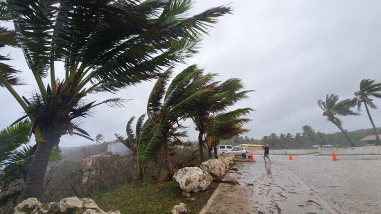 태풍으로 열대식물들이 바람에 휘어지고 있는 모습.