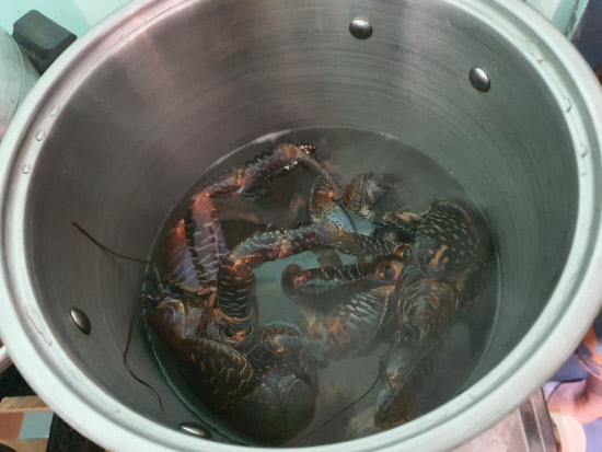 차로 돌아와서 코코넛크랩을 찾는데. 두 마리가 사라지고 없었다. 두 마리만 냄비에 넣고 삶았다. 에메랄드빛이 감도는 어두운 고동빛의 코코넛크랩이 빨갛게 달아올랐다.