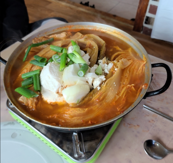 당연, 김치찌개가 젤 낫다는 말과 함께 날씨도 쌀쌀하니 선택으로 고민할 필요가 없다. 나온 김치찌개는 딱 봐도 묵은지다. 특이한 건 그 위에 순두부가 눈 내려 쌓인 듯 묵은지 위에 하얗게 쌓여있다. 펄펄 끓으니 속을 뒤집어 김치를 썰고 돼지 갈비뼈에 붙어있는 잘 익은 살점을 바른다. 조금 더 끓여도 국물은 맑다. 한 숟갈 떠먹어보니 칼칼한 맛이 일품이다. 국물이 진득할 것 같고, 김치에 붙어있는 고춧가루가 그득할 것 같은데 그렇지 않다. 묵은지를 한 번 씻어 끓인 거란 걸 한눈에 알겠다.