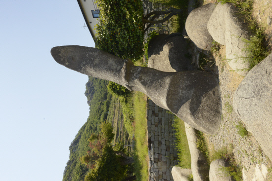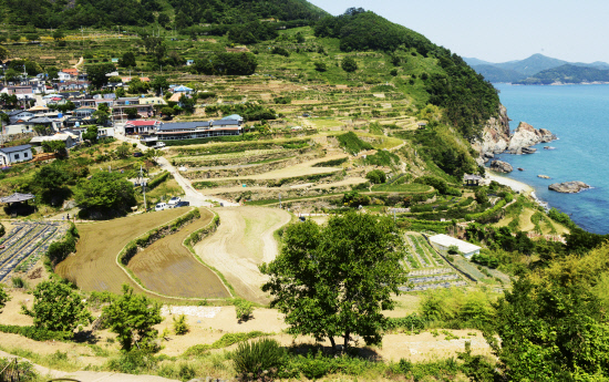 산과 바다, 그 사이 남해사람들이 삶을 영위하기 위해 억측같이 일궈놓은 삿갓배미 다랭이논이 언덕 끄트머리에 위태롭게 대롱대롱 매달려 있다. 삿갓배미는 워낙 좁은 벼랑에 논을 치면서 너무 작게 만들어져 삿갓으로 덮으면 안보일 정도여서 그렇게 불렀다. 다랭이마을 명물인 암수바위(경남민속자료 제13호)와 밥무덤 해안가와 정자 등을 돌아보는 데 30분정도 걸린다. 뜨거운 태양 아래 오후 2시가 못돼 다랭이지겟길을 떠날 수 있었다.