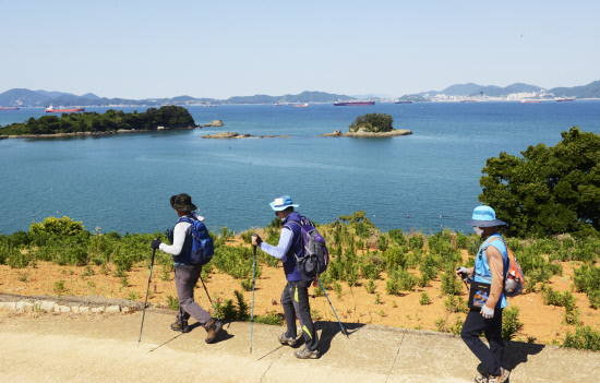 산등성이에서 뒤돌아보면 사촌마을 뒷산은 바다고둥처럼 생겨 고동산(359m)이다. 고동산 기슭 섬이정원은 점처럼 작게 보인다. 한려해상공원의 아름다운 뷰를 자랑하는 섬이정은 오래된 돌담과 연못, 생울타리에 다양한 초본과 억새들로 조성한 유럽식 정원이다. 오른쪽 진행방향은 응봉산, 더 진행하면 설흘산이다.