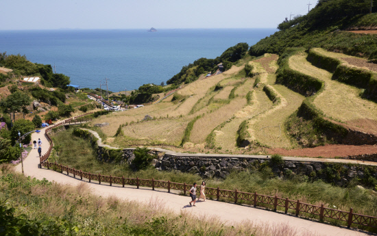 뜨거운 초여름날 띄약볕 아래, 몽돌해수욕장을 지날 때면 얼굴이 몽돌만큼 달궈지고 사촌을 지날 때면 발바닥이 간지럽다. 빛담촌을 떠난 바래길은 어느새 울창한 숲 터널로 들어간다. 경사가 큰 마지막 오름길은 숨이 차오른다. 거친 숨에 대한 보상은 산을 내려와 다랭이마을 어귀에서 받을 수 있다. 한눈에 들어오는 바다, 가슴이 벅차오르고 눈이 시원해진다. 들쭉날쭉 제 멋대로 생긴 논들이지만 그 사이사이로 산책로와 전망대가 있어 여유로움이 느껴진다.