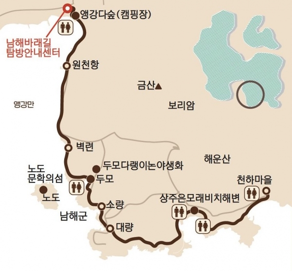 남해바래길 탐방안내센터(앵강다숲마을)출발, 원촌마을→벽련마을→두모마을→소량마을→대량마을→상주은모래비치→금포마을→천하마을.