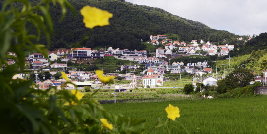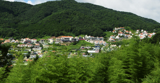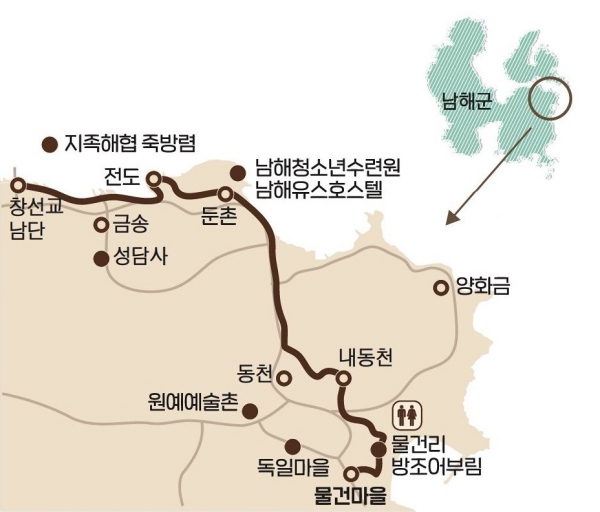 숲을 벗어나 독일마을의 아름다운 풍경을 보면서 산등성이를 넘어간다. 오른쪽 산 중턱 전망 좋은 곳에 우뚝 선 중형호텔이 눈에 들어온다. 독일마을, 물건마을, 물건항, 일출 등 조망권이 좋은 곳으로 정평이 나 있다.