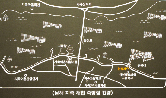해안선을 따라 바다 쪽으로 나갔다가 다시 내륙으로 들어오기를 몇 차례, 출발 3시간이 넘은 12시 52분께 죽방렴 관람대 앞을 통과한다.