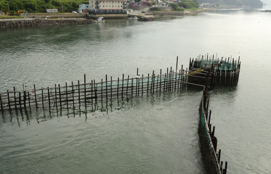 ▲바래길은 지족해협을 건너 창선도로 넘어간다. 지족을 가로지르는 창선교 위에서 바다에 세워진 죽방렴을 가까운 곳에서 볼 수 있다. 쏜살같이 내달리는 물살을 보노라면 어지럼증이 생긴다. 평소 다리 위에서 낚시를 하는 이가 많은지 낚싯줄과 찌가 널브러져 있다.
